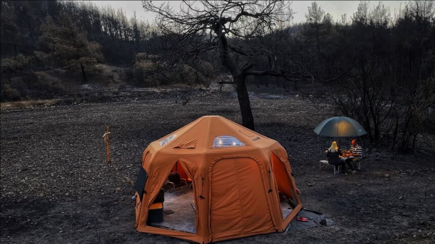 Kamp dendiğinde akla gelenler; kuş cıvıltıları, yaprak hışırtıları, çalıların arasında hareket eden bir kaplumbağanın sesi ve serin bir ağaç gölgesi altında geçirilen huzurlu saatlerdir. Peki ya sessizliğe bürünmüş, is kokusunun hâkim olduğu ve yaşamın yerini karanlık izlere bıraktığı bir ormanda kamp yapmak?