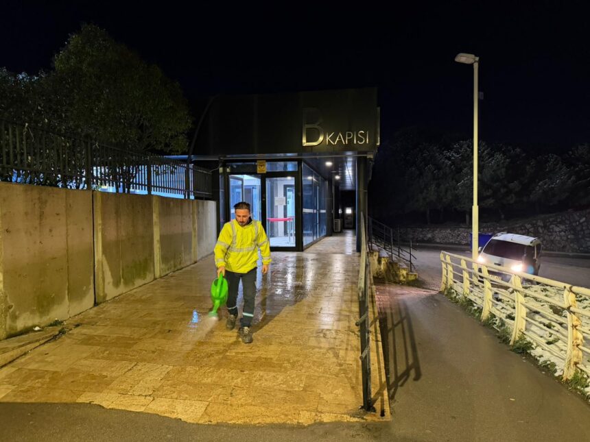 Büyükşehir Belediyesi’ne bağlı ekipler, özellikle vatandaşların yoğun olarak kullandığı durak önleri, üst geçitler, merdivenler ve hastane girişlerinde solüsyon ve tuzlama çalışmaları gerçekleştirdi. Gece boyunca devam eden çalışmalar, yeni yılın ilk saatlerinde de kesintisiz şekilde sürdürüldü.
