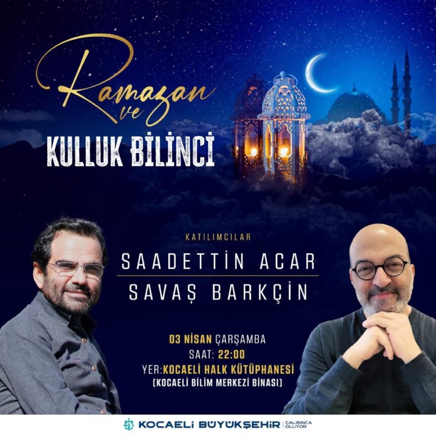 Kocaeli Büyükşehir Belediyesi, birbirinden önemli kalemleri okurlarıyla buluşturmaya devam ediyor. Büyükşehir bu kapsamda Siyaset Bilimci ve Yazar Savaş Barkçin’i ağırlayacak. Barkçin, yazar Saadettin Acar’ın moderatörlüğünde “Ramazan ve Kulluk Bilinci” konulu bir söyleşi gerçekleştirecek. Ramazan akşamına anlam katacak olan etkinlik 3 Nisan Çarşamba akşamı 22.00’de başlayacak. Tüm vatandaşların davetli olduğu söyleşi Bilim Merkezi içinde faaliyet gösteren Kocaeli Halk Kütüphanesi’nde düzenlenecek.