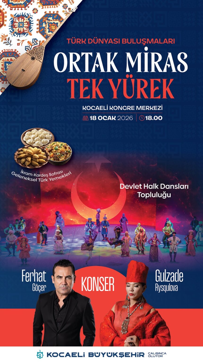 Kocaeli Büyükşehir Belediyesi ev sahipliğinde 18 Ocak Pazar günü saat 18.00’de Kocaeli Kongre Merkezi’nde düzenlenecek “Ortak Miras Tek Yürek” kültür etkinliği, Ferhat Göçer ve Gulzade Rysqulova konserleri ile Türk Dünyası’nın ortak tarihini, kültürünü ve kardeşlik bağlarını sanat aracılığıyla aynı sahnede buluşturacak.
