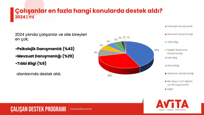 Son beş yılda en çok tercih edilen hizmet, psikolojik danışmanlık oldu. Pandemi döneminde (%33) yoğun talep gören bu hizmet, 2024 itibariyle %43’e yükseldi. Bu artış, çalışanların ruh sağlığını koruma ihtiyacının giderek arttığını gösteriyor. Psikolojik destek alanların %84’ü kendileri için, %14’ü eşleri veya aile bireyleri için, %2’si ise çocuklarıyla ilgili uzmanlara başvurdu. En sık danışılan konular arasında kaygı belirtileri (%17), çocukluk gelişimi (%14) ve depresif belirtiler (%7) öne çıktı.