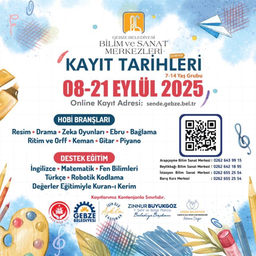 Gebze Belediyesi’nin Bilim ve Sanat Merkezleri için kayıtlar başladı. 8 Eylül – 21 Eylül tarihleri arasında www.sende.gebze.bel.tr adresi üzerinden online olarak yapılacak başvurularda, birbirinden farklı hobi ve destek eğitimleri öğrencilere sunulacak.