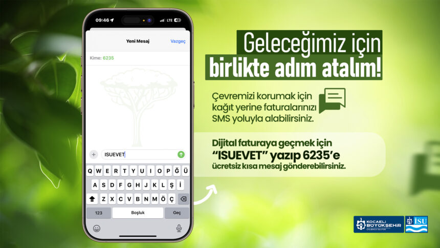 Kocaeli Büyükşehir Belediyesi İSU Genel Müdürlüğü, çevreyi koruyan dijital fatura uygulamasını aboneler için daha erişilebilir kılmak amacıyla çalışmalarını sürdürüyor. Aboneler, ISUEVET yazarak 6235 numarasına gönderecekleri ücretsiz SMS ile hızlı bir şekilde dijital faturaya geçiş yapabiliyor.