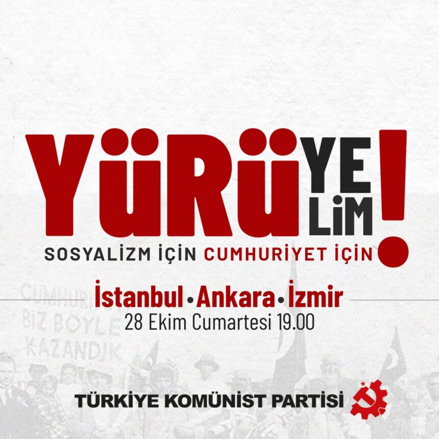 Cumhuriyet’in 100’üncü yılını 22 Ekim’de İzmir’de yaptığı coşkulu bir halk buluşması ile selamlayan TKP, 28 Ekim Cumartesi günü için de üç büyük ilde yürüyüş çağrısı yaptı.