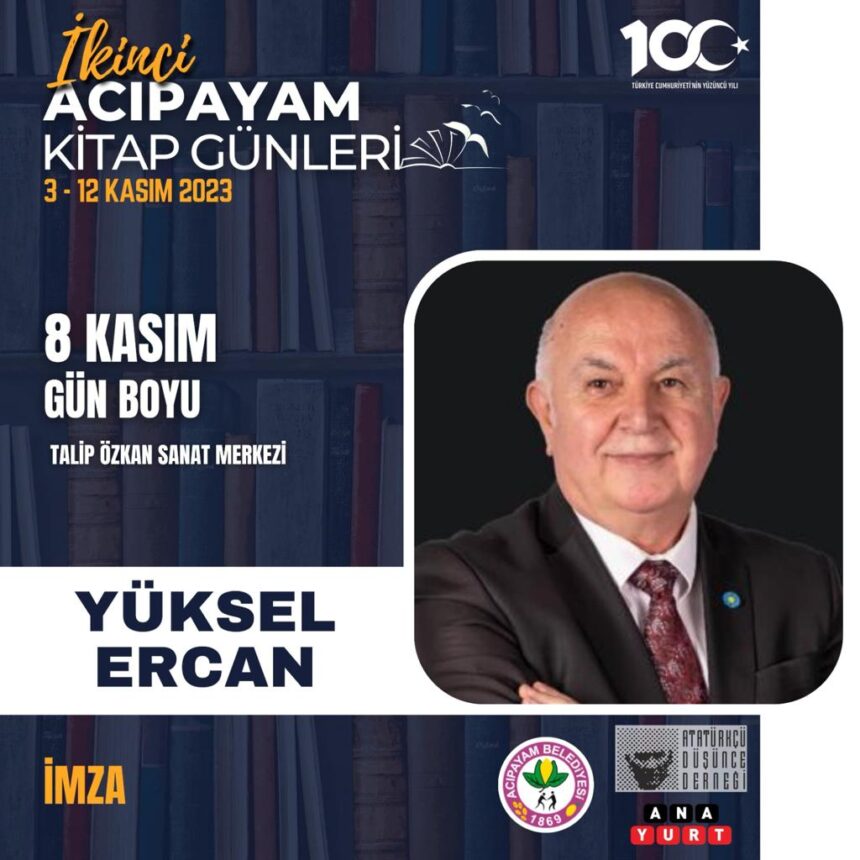 08 Kasım 2023 Perşembe günü Acıpayam belediyesi Talip Özkan Sanat  Merkezinde gün boyu kitapseverler ile bir araya gelecek olan Yüksel Ercan’a kitabın baskısını yapan Anayurt yayınevi sahibi Mustafa Anayurtlu’da eşlik edecek.